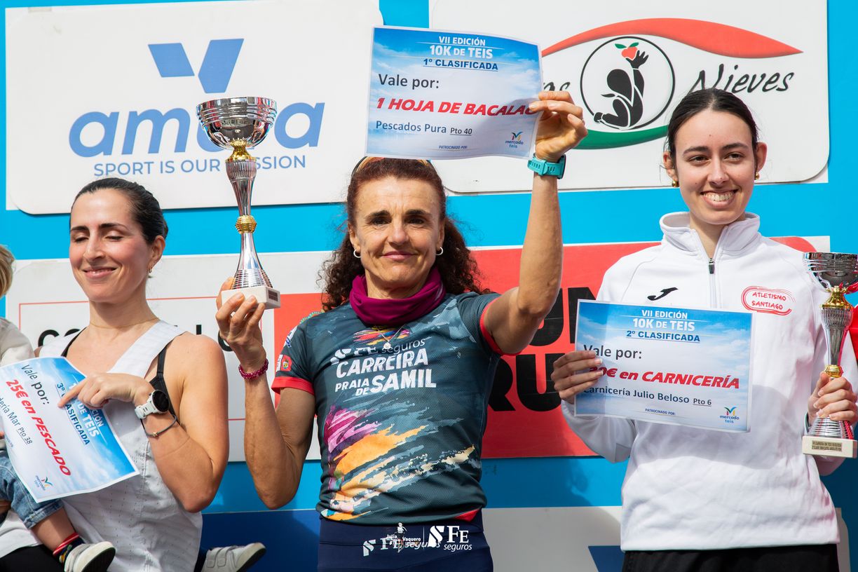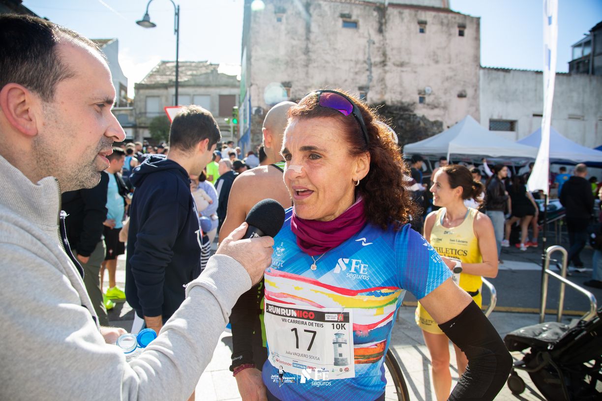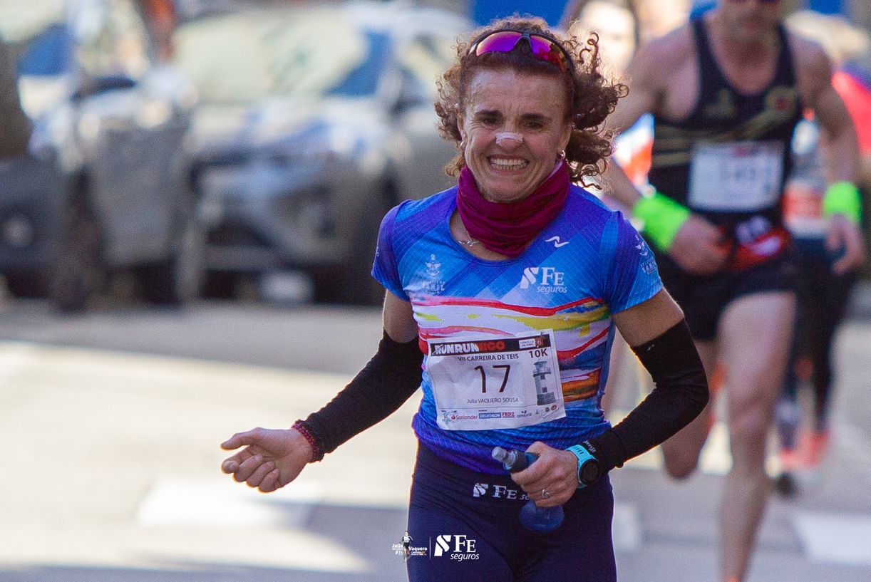 Nuestra compañera olímpica Julia Vaquero (55, veteranos de Samil) fue la ganadora absoluta de esta tercera jornada del circuito “Run-Run” celebrada en el barrio vigués de Teis, sobre un trazado de asfalto muy exigente, con cuestas bastante empinadas al bajar y por supuesto para subirlas ya en la parte final. “Franc el cuádriceps de la pierna izquierda se me cargaba al bajar. También es cierto que era la pierna sobre la que me caí el otro día entrenando con la bici y es posible que todavía estuviera condolida. Pero bueno, supe correr a un buen ritmo, controlando el esfuerzo” comentaba Julia.